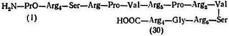 Протамины представляют собой основные белки с малой молекулярной массой; они присутствуют в хроматине спермы вместо гистонов. Протамины появляются на стадии сперматиды и заменяют гистоны хроматина. Для них характерен полиморфизм. В сперме форели содержатся протамины трех типов, состоящие из 31–33 аминокислот. Протамины спермы млекопитающих длиннее — в их цепях ~45 аминокислот. Они богаты аргинином и не содержат лизина и триптофана; аргинин составляет две трети всех аминокислот. Собирающиеся в кластеры аргининовые остатки образуют длинные участки, с помощью которых протамины связываются с ДНК сперматид. После образования этой связи транскрипционная активность хроматина полностью подавляется. Если удалить протамины, то хроматин принимает вид бусинок и становится чувствительным к микрококковой нуклеазе. При добавлении протаминов эта структура исчезает и хроматин становится невосприимчивым к нуклеазе. Сериновые остатки протаминов могут быть фосфорилированы и дефосфорилированы. Полагают, что эта ковалентная модификация необходима для правильного связывания протаминов с ДНК [105], Ниже показана структура типичного протамина рыб: