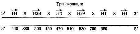 Структурные гены гистонов не содержат интронов, или нетранслируемых областей, как гены глобина, яичного альбумина и иммуноглобулина, а также не транскрибируются как более длинные предшественники РНК [312]. Спейсерные области не имеют небольших повторяющихся последовательностей оснований, как это наблюдается у генов рРНК и 5S-PHK. У всех видов морских ежей порядок расположения и направления транскрипции гистоновых генов одинаковы, тогда как у разных видов Drosophila они различны [230]: