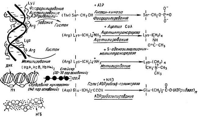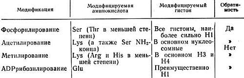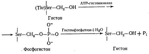 Процесс фосфорилирования — дефосфорилирования внутренних остатков хромосомных белков совершается с большой скоростью. Быстрое фосфорилирование наблюдается не только в делящихся, но и в неделящихся клетках после их стимуляции различными эффекторами. В основном фосфорилированию подвержен гистон Н1, т. е. фосфорилирование гистонов, по-видимому, не влияет на транскрипционную активность хроматина.