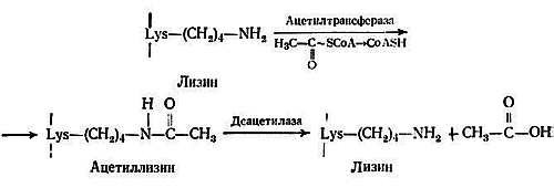 Есть сообщение о наличии у гистонов ацетильных групп [288]. Ацетилирование гистонов в изолированных ядрах впервые было описано Олфри с сотрудниками [13]. В гистонах обнаружены ацетилированные аминокислотные остатки двух типов: а) NH2-концевой серии гистонов Н1, Н2А и Н4 ацетилируется в N-ацетилсерин; это необратимая постсинтетическая модификация, катализируемая ферментом, содержащимся в цитозоле; б) ацетилированные внутренние лизиновые остатки образуются в результате постсинтетической реакции, протекающей в цитозоле [308] и в ядре после того, как гистоны переходят из цитозоля в ядро и связываются с ДНК [65]. Ацетилирование внутренних остатков в гистоне Н1 либо незначительно, либо вообще отсутствует. Ацетилируется один центр в гистоне Н2А и по четыре центра в каждом из гистонов Н2В, Н3 и Н4. Ацетилирование лизиновых остатков катализируется ацетилтрансферазой, являющейся компонентом НГБ. ε-NH2-группы внутренних лизиновых остатков, расположенных на NH2-концах половины гистонов, ацетилируются с образованием ε-N-ацетиллизина [11, 101, 130], причем в одной молекуле может содержаться до четырех ацетильных групп. Это энергозависимая реакция, в которой источником ацетильной группы является ацетил-CoA. Деацетилирование катализируется деацетилазой, которая также присутствует в хроматине. Схема реакции приведена ниже: