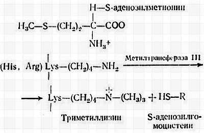 Метилирование гистонов является постсинтетической необратимой модификацией, которая катализируется гистон-метилтрансферазой III, присутствующей во фракции НГБ хроматина. Эта модификация была впервые обнаружена Олфри и сотрудниками [13]. Гистон-метилтрансфераза III катализирует переход СН3-группы из S-аденозилметионина в ε-NH2-группу лизинового остатка, как показано ниже: