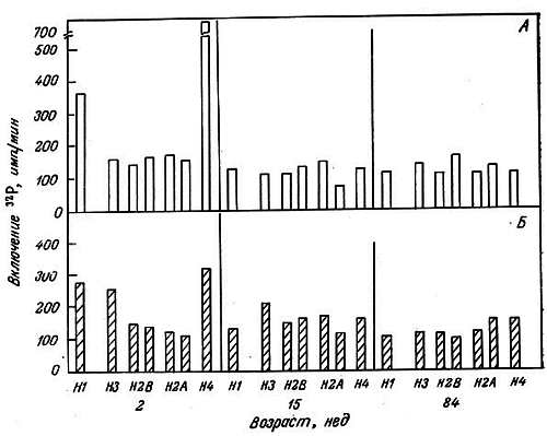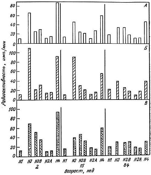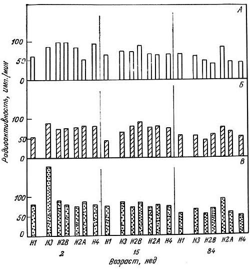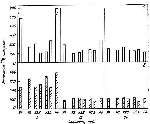 Гистон Н1 отличается от остальных гистонов быстрым обменом в культуре клеток [16]. В то время как синтез остальных четырех гистонов связан с синтезом ДНК и происходит только в S-фазе, синтез Н1 в клетках штаммов Friend и HeLa может происходить и в отсутствие синтеза ДНК, т. е. в G1-фазе [385]. В клетках ВНК синтез гистона Н1 также частично происходит в G1-фазе,[343].