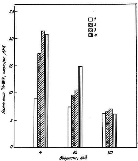 Каково же значение этих двух функциональных изменений в ДНК для организма и для процесса старения? Все многоклеточные организмы начинают стареть после достижения половой зрелости. Являются ли причиной старения дифференцировка и (или) постмитотическая природа клеток? Будет ли предотвращено старение, если остановить одно или оба изменения ДНК? Являются ли эти функциональные изменения ДНК необратимыми? Известно, что ДНК в клетках не находится в изолированном состоянии. Она связана в комплекс с белками двух типов: гистонами и негистоновыми хромосомными белками (НГБ), которые вместе с ДНК образуют надмолекулярный комплекс, называемый хроматином и представляющий собой генетический аппарат эукариотов. Три компонента присутствуют в комплексе приблизительно в равных пропорциях. Здесь же обнаружена и РНК, однако полагают, что она является продуктом транскрипции ДНК, а не структурным компонентом. Функция ДНК известна, роль же белков в функционировании хроматина определена недостаточно. Изменяются ли они в течение жизни? Для того чтобы выяснить, вносят ли вклад в процесс старения изменения в одном или нескольких компонентах хроматина, необходимо установить его химический состав и структуру. Структура и функции хроматина описаны в нескольких обзорах [12, 57, 74, 112, 116, 199,354].