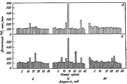 Приведенные выше заключения подтверждаются следующими фактами. Транскрипционно неактивный гетерохроматин инфузорий имеет низкую степень ацетилирования, тогда как эухроматин транскрипционно активен и сильно ацетилирован [232]. Транскрипционно активные макроядра Tetrahymena pyriformis содержат ацетилированные гистоны, тогда как в репрессированных микроядрах их нет [136]. Активные материнские хромосомы червеца содержат значительно больше ацетильных групп, чем неактивные отцовские хромосомы [34]. В исследованиях, выполненных на клетках Drosophila в культуре [227], показано, что 14С-ацетат включается главным образом в гистоны Н3, Н4 и Н2В, а 32Р-фосфат — в гистоны Н1, Н3 и Н4. Самое высокое содержание как 14С-ацетата, так и 32Р наблюдается в гистоне Н3. Когда матрично активные и матрично неактивные области хроматина разделяли после его переваривания ДНКазой II, было обнаружено, что первые содержат большее количество обеих меток (14С и 32Р). Эти данные подтверждают предположение, что различия между транскрибируемыми и нетранскрибируемыми областями хроматина отчасти объясняются специфическими модификациями гистонов в определенных локусах.