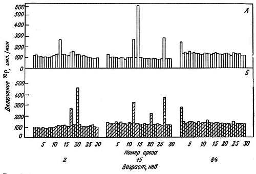 Экдизон — стероидный гормон, ответственный за развитие насекомых — вызывает образование пуффов в хромосомах слюнных желез у личинок Sciara [133]. Возникновение пуффа указывает на то, что в данном участке происходит транскрипция. В месте пуффа, вызванного действием экдизона, не наблюдается увеличения содержания гистонов или ДНК, в то время как содержание НГБ почти удваивается. Пуффы образуются лишь после окончания определенной стадии развития, когда клетки становятся компетентными (17-дневные личинки); они не появляются у 4-дневных личинок. Это свидетельствует о том, что для действия экдизона необходим какой-то цитоплазматический фактор, вероятно белок. Следовательно, прежде чем экдизон сможет оказать воздействие на специфические гены, должен быть активирован определенный ген, ответственный за синтез этого белка. При возникновении пуффов в политенных хромосомах Drosophila отношение белков к ДНК увеличивается с 6 до 16, количество РНК увеличивается вдвое, а Тm данного участка понижается на 10 °C [281]. Кроме того, около пуффов накапливаются НГБ. В содержании ДНК и гистонов, связан дается никаких изменений, а большая часть гистонов, связанных с ДНК, оказывается дестабилизированной. Эти наблюдения подтверждаются результатами, полученными с помощью иммунофлуоресценции, согласно которым пуффы, индуцированные в политенных хромосомах Drosophila тепловым ударом, содержат новые НГБ. Очевидно, НГБ ответственны за активацию генов.