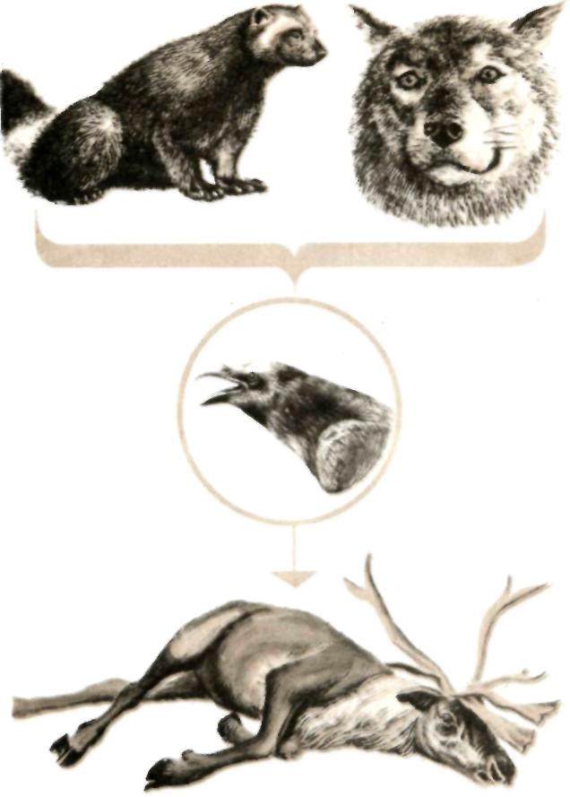 Ворон продолжал свои игрища на большой высоте, громкий голос его был слышен издалека, и уже другие лесные жители, восприняв весть, стали появляться через некоторое время возле туши. Вначале пришла старая росомаха, а потом и молодая. Появились волки. Сомневаться в том, что именно ворон навел их на цель, не приходилось. Не будь ворона, звери и знать бы не знали, что здесь можно поживиться: их маршруты пролегали в нескольких километрах от участка, где птица обнаружила тушу, и ветер дул не в их сторону.