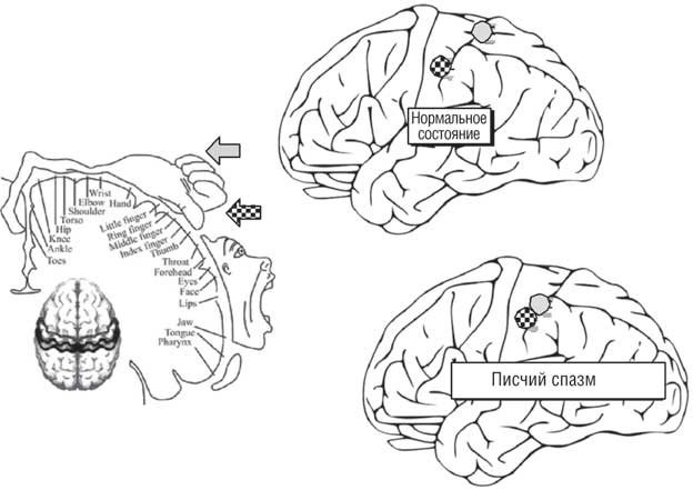 Рис. 35. В нормальном состоянии на гомункулюсе коры моторные зоны пальцев отстоят друг от друга, в частности мизинец (серый цвет) отстоит от большого пальца (шашечки), при писчем спазме эти области совмещаются, и их дифференциация нарушается, соответственно осуществление движений также нарушается