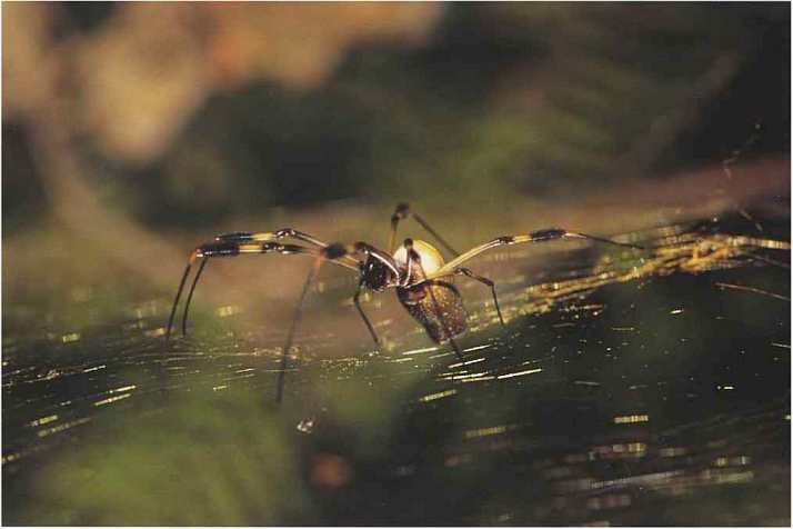 В свете лучей вечернего солнца видны сверкающие золотистые нити паутины, сплетенной пауком-златоткачиком. Глядя на эту фотографию, становится понятно, за что этот вид пауков получил такое название.
