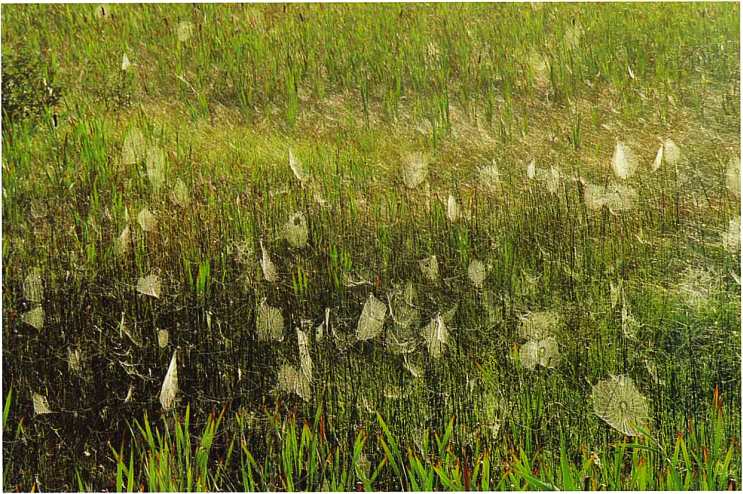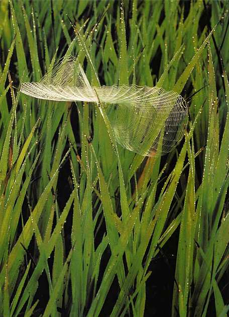 Очень немногие представляют себе, сколько пауков обитает в лугах. На этой фотографии, благодаря удачному сочетанию обильной росы и низкого угла падения солнечных лучей, отчетливо видно множество ловчих сетей.