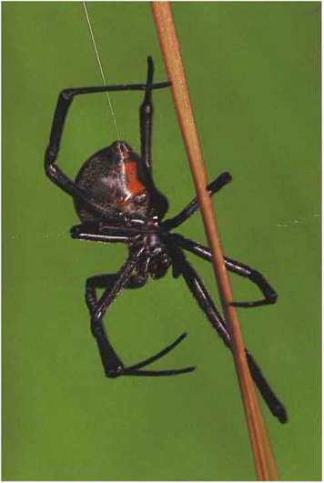 Этот паук «черная вдова» (Latrodectus mactans) пользуется своим шелком не только для сооружения ловчей сети и вынашивания потомства, но и для плетения своеобразных спасательных канатов.