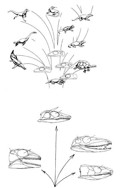 РИСУНОК 38. (а) — Родословное древо рептилий (в основании соответствующих ветвей — схематически изображенные типы черепа); (б) — происхождение четырех типов черепа.