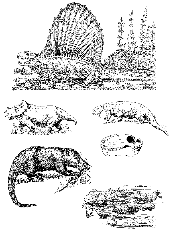 Первыми такого успеха добились тероморфы. Появившиеся еще в позднем карбоне пеликозавры — удивительные создания, многие из которых имели «парус» из остистых отростков позвонков (рисунок 40, а) — составляли в ранней перми 70 % всех амниот. Мощные клыки и непропорционально большая голова свидетельствуют о том, что пеликозавры были изначально ориентированы на питание крупной добычей; они были первыми хищными (в смысле — плотоядными, а не насекомоядными) наземными существами. Тем интереснее то обстоятельство, что многие пеликозавры переходят к растительноядности — первый опыт фитофагии среди наземных позвоночных! Последнее — чрезвычайно важно, ибо дефицит потребителей растительной массы в континентальных экосистемах должен был к тому времени стать просто угрожающим.
