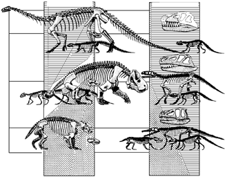 РИСУНОК 41. Замещение тероморфов завроморфами-архозаврами в триасовых фаунах. Процесс шел параллельно и среди фитофагов (замещение дицинодонтов и ринхозавров на растительноядных динозавров-завропод), и среди хищников (замещение цинодонтов на текодонтов).