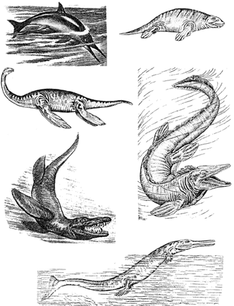 РИСУНОК 42. Мезозойские морские рептилии: эвриапсиды (а-г) и диапсиды (д-е). (а) — ихтиозавр, (б) — плакодонт, (в) — плезиозавр-эласмозавр, (г) — плезиозавр-плиозавр, (д) — мозозавр, (е) — морской крокодил.