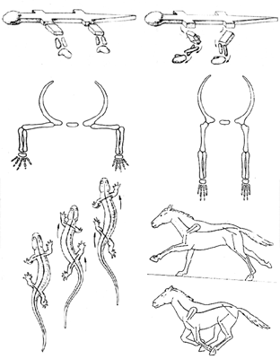 Однако еще в середине прошлого века Т. Гексли, друг и сподвижник Ч. Дарвина, провел анатомическое сравнение четырех классов тетрапод, дабы установить — кто чьим предком является. Глубокое сходство птиц и рептилий уже в те времена не вызывало особых сомнений; когда говорят, что «птицы — всего лишь продвинутая и сильно специализированная группа рептилий», это, в общем и целом, соответствует истине. Гексли, однако, обратил внимание и на куда менее очевидное, но весьма существенное сходство млекопитающих (маммалий) с амфибиями. Сходство это он видел в строении кожи — мягкой и богатой железами, почек, выделяющих мочевину (у рептилий с птицами почки выделяют мочевую кислоту), и в наличии двух затылочных мыщелков, которыми череп сочленяется с позвоночником (у рептилий с птицами — один). Самыми серьезными, однако, Гексли счел различия в строении кровеносной системы: у амфибий имеются две дуги аорты — правая и левая, у рептилий и птиц сохраняется только правая дуга, а у млекопитающих — только левая. То есть — «вывести» маммальную кровеносную систему из рептилийной (где левая дуга уже редуцирована) принципиально невозможно. На этом основании он заключил, что предками млекопитающих не могут быть рептилии — по крайней мере, ныне живущие, — и маммалии должны вести свое происхождение прямо от амфибий.