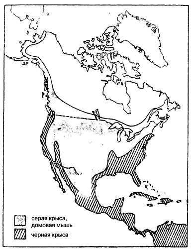 Схема распространения серой (норвежской) крысы, домовой мыши и черной крысы на территории Северной и Центральной Америки