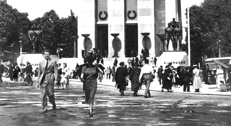 Французская открытка с международной выставки в Париже, 1937 г. Павильон нацистской Германии. С двух сторон стоят скульптуры, левая – с фигурами двух мужчин нордического типа, объединенных рукопожатием. Эта идеологически удачная композиция, но без женщины на заднем плане и под названием «Товарищество» выставлялась в гитлеровском «Доме германского искусства» в Мюнхене. Позже «Товарищество» стало одним из символов германского нацизма. Часто используется как прообраз сверхчеловека
