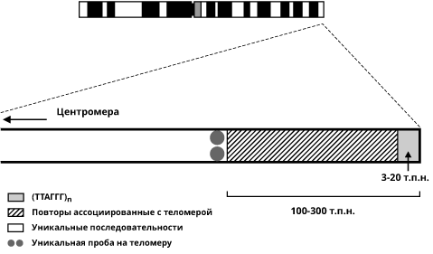 3а короткими повторами располагаются более длинные повторяющиеся последовательности, которые назвали повторами, ассоциированными с теломерой. Далее следуют уникальные для каждой хромосомы последовательности, которые на практике используются для различения разных концов разных хромосом. Теломеры защищают основную часть ДНК от действия ферментов, которые в отсутствие теломер разрушали бы молекулы ДНК. Кроме того, теломеры способствуют правильной рекомбинации хромосом и их прикреплению к оболочке ядра.