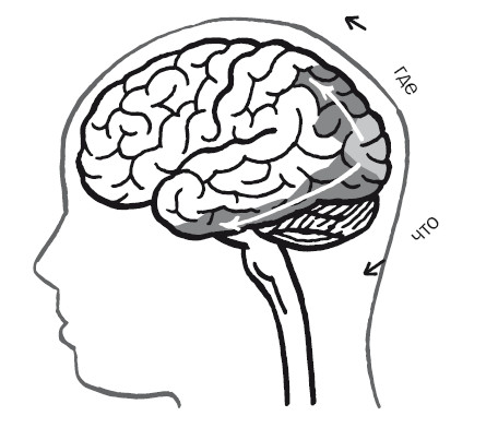 Разумеется, в повседневной жизни мы не трудимся проводить различие между зрительным восприятием автомобиля (первичная зрительная кора), узнаванием автомобиля (поток «что») и его локализацией в пространстве (поток «как/где»). Мы просто видим. И даже внутри мозга потоки не являются совершенно обособленными: есть множество обратных и перекрестных связей, гарантирующих, например, что вы тянетесь за нужной вещью в нужное время. Тем не менее эти потоки достаточно независимы, так что нарушение каждого из них приводит к катастрофическим результатам.