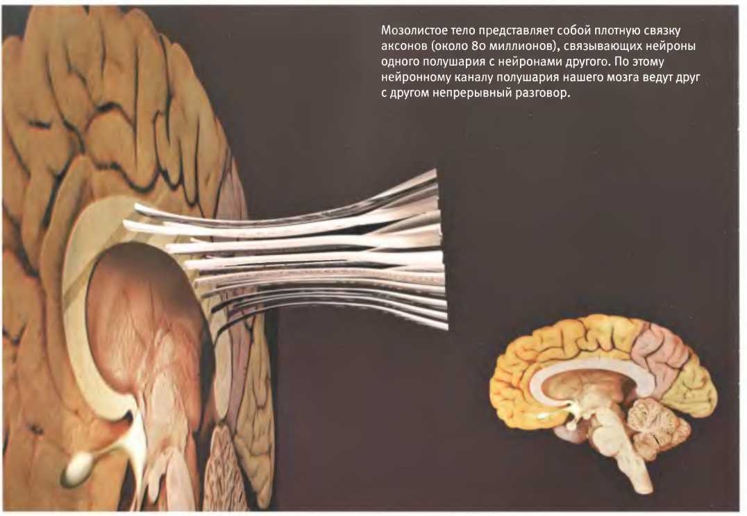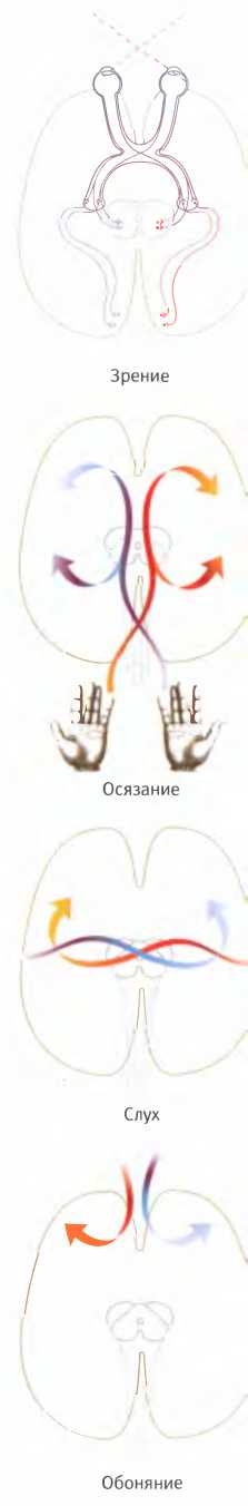 Информация, получаемая нашим мозгом от органов чувств, вначале по большей части поступает для обработки в полушарие, противоположное той стороне тела, где она возникает. После этого она быстро передается в другое полушарие по мозолистому телу, а) Зрительная информация из левой половины каждого глаза идет в правое полушарие, и наоборот, б) За исключением некоторых лицевых нервов, проводящие пути, сообщающие мозгу информацию об осязаемых раздражителях, ведут в полушарие, расположенное в другой половине тела, в) Обработка большей части информации о звуках тоже происходит не на той стороне мозга, где находится ухо, которое их слышит, г) Обоняние составляет исключение из правила перекрестной обработки входящих сигналов: обработка информации о запахах происходит в той же половине головы, где расположена ноздря, через которую эти запахи поступают.