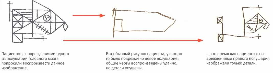 Кроме того, правое полушарие хорошо схватывает вещи целиком, в то время как левое предпочитает детали. К числу сильных сторон нашего правого полушария относится способность распознавать замаскированные образы на сложном фоне и с ходу улавливать узоры и закономерности. Эта способность вполне могла играть важную роль в выживании наших предков, позволяя им вовремя замечать опасных хищников. Левое же полушарие, напротив, хорошо умеет разбивать сложные узоры на составляющие. Это умение, в свою очередь, может способствовать выживанию в большой корпорации, позволяя человеку последовательно, шаг за шагом, реализовывать свои планы, пробиваясь сквозь бюрократические препоны, но в джунглях одно лишь левое полушарие не видело бы за деревьями леса — и тем более не видело бы за ними голодного медведя.