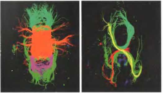 В очень редких случаях мозолистое тело может вообще не развиваться, делая нормальное общение полушарий невозможным. Результаты работы, проведенной недавно в центре биопсихосоциальных исследований Научно-исследовательского института Трэвиса в Пасадене (штат Калифорния), показали, что у пациентов, страдающих этим недугом, обычно наблюдаются симптомы, похожие на проявления болезни Аспергера: затрудненная социализация, склонность к буквальному пониманию слов и проблемы с пониманием нюансов сложных ситуаций. Кроме того, у таких пациентов часто встречаются нарушения координации и трудности с узнаванием. Слева. Рыжим цветом отмечено скопление путей, по которым в нормальном мозгу передается информация между полушариями. Справа. У этого человека полушария связаны лишь тонкой нитью мозговой ткани, способной передавать информацию только по капле. Обмен информацией при этом происходит в участках мозга, расположенных ниже (по путям, отмеченным желтым и зеленым).