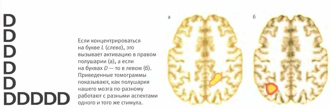 Какую функцию нашего мозга ни возьми, почти все они связаны с одним полушарием в какой-то степени сильнее, чем с другим. Что именно лежит в основе такой специализации, не вполне понятно, но, судя по всему, поступающая в мозг информация расходится по нескольким параллельным путям, на каждом из которых она обрабатывается несколько по-разному. Сведения, особенно “интересные” какому-то одному полушарию, активируют соответствующую половину мозга сильнее, чем другую. Это явление можно наблюдать при сканировании мозга: во время выполнения того или иного задания сторона мозга, “ответственная” за требуемые для его выполнения навыки, загорается гораздо ярче, чем расположенный симметрично участок противоположной стороны.
