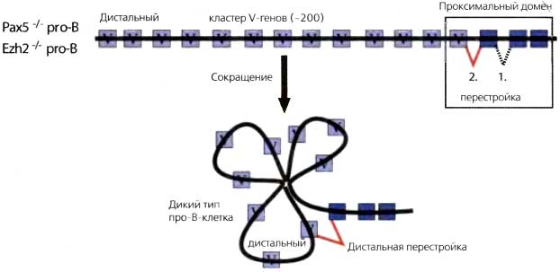 Локус IgH состоит из проксимального домена, содержащего следующие генные сегменты: разнообразия (diversity, D), соединительные (joining, J) и константные (constant, С), а также большой кластер вариабельных (variable, V) генов с ~200 генами V, расположенными на участке длиной более 2,4 млн. о. Локус IgH находится в растянутой конфигурации в про-В-клетках Pax5-/- или Ezh2-/-, что позволяет V(0)1-рекомбинации осуществиться только в проксимальном домене. В про-В-клетках дикого типа все гены VН участвуют в перестройках VН-DH благодаря сокращению локуса IgH путем выпетливания