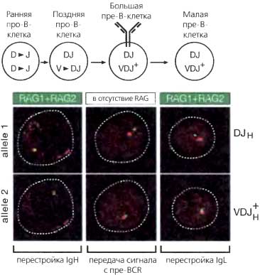 В ранних про-В-клетках реорганизации типа DH-JH происходят одновременно в обеих аллелях IgH, тогда как в поздних про-В-клетках только одна аллель в это время подвергается рекомбинации по типу VH-DJH. Ядра рассортированных про-В- и пре-В-клеток были проанализированы трехмерным DNA-FISH с флуоресцентными зондами из дистального (красный) и проксимального (зеленый) участков локуса IgH. Две аллели IgH одной и той же клетки показаны на двух репрезентативных конфокальных срезах. Пре-BCR сигнал приводит не только к быстрой потере белка RAG, но и к устранению сокращения локуса IgH. Хотя обе аллели не находятся в состоянии сокращения, локус IgH полностью растянут только в случае не окончательно DJH-перестроенной аллели. Эти два сигнала функционально перестроенной аллели (VDJ+) разделены более коротким расстоянием благодаря делеиии внедренной последовательности ДНК. Данные по FISH взяты из Roldan et al. (2005)