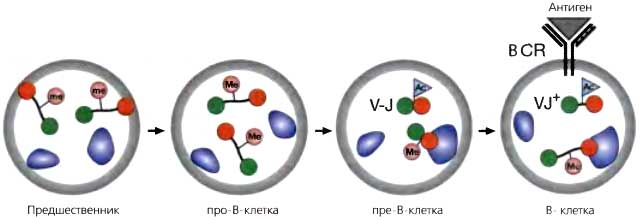 Процесс аллельного исключения может быть разделен на два отдельных этапа. В течение фазы инициации одна из двух аллелей Ig выбирается посредством дифференциального эпигенетического маркирования, чтобы быть реорганизованной в первую очередь, что препятствует одновременной рекомбинации в двух аллелях. Экспрессия продуктивно реорганизованной аллели впоследствии предотвращает рекомбинацию во второй аллели посредством ингибирования по типу обратной связи, таким образом поддерживая аллельное исключение. Процесс аллельного исключения уже инициирован на ранних стадиях развития во время имплантации, когда две аллели гена рецептора антигена начинают асинхронно реплицироваться в каждой клетке. Отцовский или материнский ген Ig, который стохастически выбирается для ранней репликации посредством пока не известной хромосомной метки, почти всегда представляет собой ту первую аллель, которая претерпевает перестройки в незрелых В-лимфоцитах (Mostoslavsky et al., 2001). Вторая Vн-DJн-реорганизация локуса IgH является, таким образом, регулируемым этапом, так как DH-JH-рекомбинация осуществляется в обеих аллелях IgH в процессе развития про-В-клеток (Bassing et al., 2002). Однако пока так ничего и неизвестно про то, как эта аллель-специфичная эпигенетическая метка, установленная на ранних стадиях развития зародыша, транслируется в последовательную активацию Vн-DJн-рекомбинации на двух аллелях IgH.