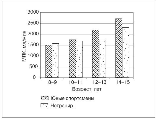 Основного развития у подростков достигают процессы аэробной энергопродукции. Бурное увеличение мышечной массы, преобладание в мышцах медленных волокон окислительного типа, нарастание в мышцах количества митохондрий и миоглобина, повышение активности окислительных, ферментов, улучшение утилизации приносимого кровью кислорода, а также совершенствование механизмов регуляции сердечно-сосудистой и дыхательной систем – все это приводит к повышению аэробных возможностей организма и величины МПК. Если в препубертатном периоде и во II стадии полового созревания у подростков аэробные возможности еще невелики, то на III стадии полового созревания (у девочек в 12–13 лет, у мальчиков – в 13–14 лет) наблюдается их резкое увеличение, На этой стадии прирост МПК (л/мин) у мальчиков составляет примерно 28 %, у девочек -17 %. У юных спортсменов прирост МПК еще больше (рис. 58). Максимальных значений абсолютные величины МПК достигают в возрасте 14–15 лет.