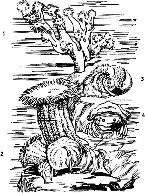 Симбиоз: 1) полипа и губки; 2 и 3) рака-отшельнка и актинии; 4) краба и губки.