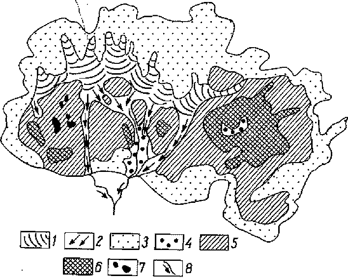 Рис. 87. План болотной системы Себ-болота [по: Юрковская и др., 1989]. 1 — грядово-мочажинные и грядово-озерные аапа комплексы, 2 — проточные топи с травяными евтрофными сообществами, 3 — древесно-травяные и травяно-сфагновые мезотрофные сообщества, 4 — сосново-сфагновые олиготрофные сообщества, 5 — грядово-мочажинные олиготрофные комплексы, 6 — грядово-озерковые и регрессивные олиготрофные и дистрофные комплексы, 7 — внутри-болотные озера, 8 — реки и ручьи.