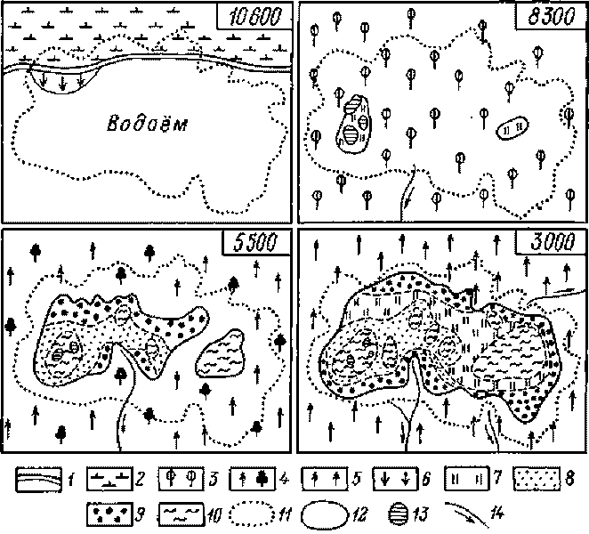 Рис. 88. Реконструкция растительности голоцена на ключевом участке болотной системы Себ-болота. В верхнем правом углу каждой схемы — возраст временного среза, лет назад. 1 — граница приледникового водоема; 2 — тундра; 3–5 — леса (3 — березовые северотаежные, 4 — еловые подтаежные, 5 — еловые южнотаежные); 6 — прибрежные заросли водных растений; 7-10 — растительность болот (7 — травяные евтрофные и мезотрофные сообщества, 8 — травяно-сфагновые мезотрофные сообщества, 9 — березовые евтрофные и мезотрофные болотные леса, 10 — травяно-сфагновые олиготрофные сообщества и комплексы). 11, 12 — границы болота (11 — современного, 12 — прошлого); 13 — внутри-болотные озера; 14 — реки и ручьи.