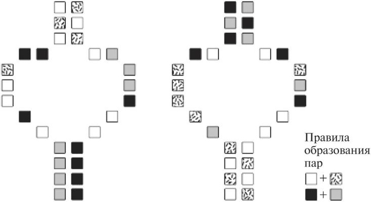 Рис. 8.1. Схема показывает, как две однонитевые молекулы длинной некодирующей РНК с различными нуклеотидными последовательностями могут образовывать структуру одной и той же формы. Структура определяется правилами образования пар. Нуклеотид А связывается только с У, а нуклеотид Ц — только с Г (они показаны квадратиками с различной окраской или узором). Перед вами упрощенная схема. На самом деле длинные некодирующие РНК могут обладать множеством участков, способных формировать сложные структуры. Кроме того, эти структуры трехмерны (здесь они для простоты изображены как плоские).