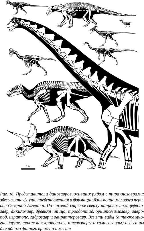 Если говорить о видах, которыми питались тираннозавры, то почти любое животное, на которое натыкался крупный тираннозавр, могло, по крайней мере теоретически, быть съедено, а в большинстве известных нам экосистем присутствовал большой выбор потенциальных жертв (рис. 16). Но все же крупные тираннозавры явно предпочитали гадрозавров. В отличие от цератопсов, эти животные зачастую были плохо защищены не только для того, чтобы сражаться, но даже для спасения жизни, так что в этом нет ничего удивительного. Большой обзор останков представителей обеих групп из продуктивных позднемеловых слоев в Альберте (Канада) показал, что около 14 % извлеченных оттуда костей гадрозавров несут следы зубов тираннозавров по сравнению с 4 % для цератопсов{73}. Однако эта информация может в действительности отражать не истинные пищевые предпочтения тираннозавров, а то, что более широко распространенные гадрозавры неизбежно становились мишенью охоты чаще, чем другие животные. На настоящий момент нет никаких данных о повреждениях ни у анкилозавров, ни у завроподов в фаунах, где доминировали тираннозавры, но и те и другие встречались довольно редко, поэтому подобная ситуация больше связана с недостатком данных, нежели с тем, что этих животных не считали добычей. Содержимое кишечника тираннозавров и их копролиты также указывают на поедание различных гадрозавров.
