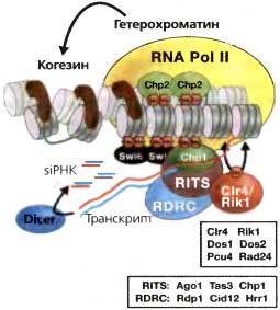 Транскрипция внешних повторов с помощью RNA pol II обеспечивает первичный субстрат для RNAi и зависимого от Dicer образования siRNA. Загрузка Ago1 в комплексе RITS (Ago1, Tas3, Chp1) молекулами siRNA делает возможным «нацеливание» гомологичного транскрипта. Действие RDRC (Rdpl, Cidl2 и Hrrl) делало бы возможной продукцию dsRNA, обеспечивая большее количество субстрата для Dcr1 для производства siRNA и, возможно, усиления сигнала. Взаимодействия между транскриптом, субъединицами RNA pol II и компонентами RNAi рекрутируют Clr4, который метилирует гистон H3 по лизину 9, делая возможным связывание хромодоменных белков, рекрутирование когезина и когезию сестринских центромер