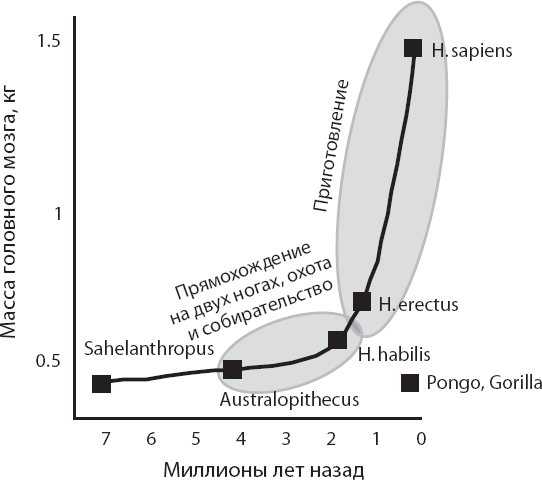 Рис. 11.2. Быстрое увеличение массы головного мозга в линии рода Homo за последние полтора миллиона лет совпадает с изобретением обработки пищи, возможно, представителями вида Homo erectus