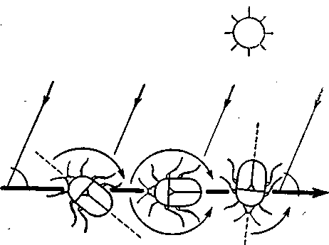 Сохранение прямого направления при передвижении не является само собой разумеющейся способностью как у человека, так и у животных. Много людей погибло оттого, что в тумане или во время пурги, думая, что идут прямо, они на самом деле ходили по кругу. Свет является одним из тех факторов окружающей среды, которые своим прямолинейным распространением определяют прямолинейный путь движения большинства живых существ. Докажем это.