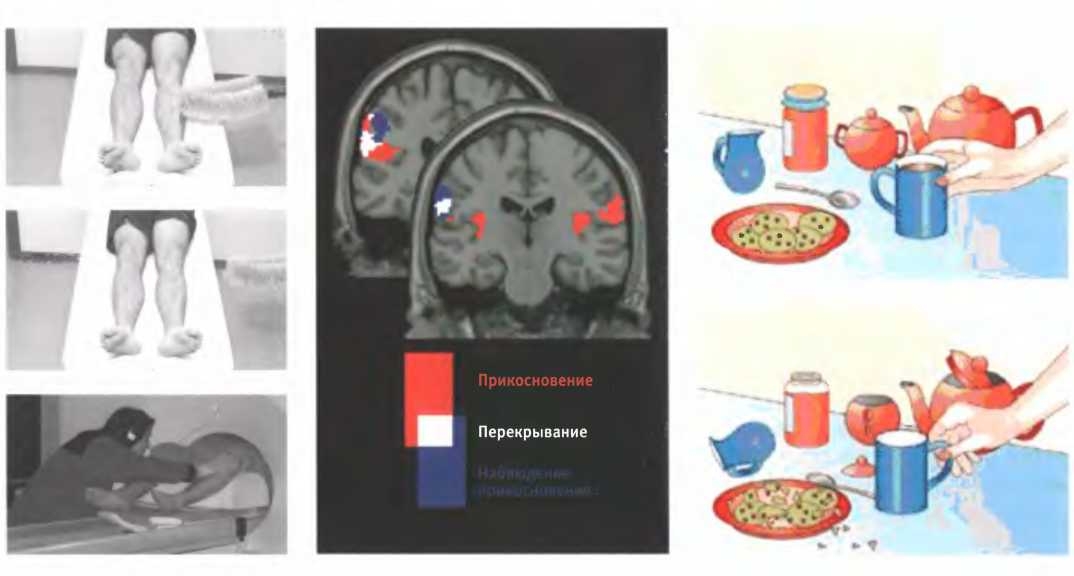 Зеркальные нейроны позволяют нам понимать, что чувствуют другие люди, совершающие какие-либо действия, а также что они чувствуют, когда к их телу кто-то или что-то прикасается. В ходе одного исследования головной мозг испытуемых сканировали, одновременно водя щеткой по их ноге или демонстрируя видеозапись того, как один человек прикасался к ноге другого. На рисунке — результаты сканирования мозга, на котором белым выделена зона перекрывания участков, возбуждавшихся от прикосновения и от наблюдения за прикосновением к другому человеку. Участки, активируемые только прикосновением к правой или левой ноге, выделены красным, а участки, активируемые только наблюдением за прикосновением, — синим. Результаты эксперимента указывают на наличие зеркальных нейронов только в левом полушарии, но другие эксперименты показали, что такие нейроны имеются и в правом полушарии6.