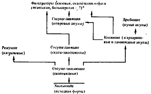 Рис. 18. Гипотетическая схема эволюции способов питания акулообразных С. Мосса