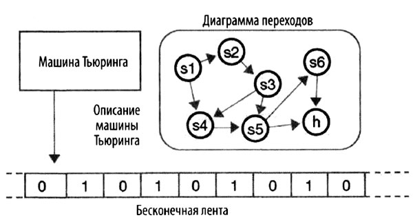 Второй важный принцип в основе теории информации я уже упоминал — это универсальность вычислительных методов. В 1936 г. Алан Тьюринг описал «машину Тьюринга», которая представляет собой не реальный механизм, а еще один мысленный эксперимент. Этот абстрактный компьютер состоит из бесконечно длинной ленты памяти, в ячейках которой располагаются цифры 1 или 0. Эта информация служит для машины входным сигналом, и машина за один раз прочитывает информацию в одной ячейке. Кроме того, машина снабжена таблицей правил (в частности, подчиняется принципу хранимой программы), представленных в виде пронумерованных утверждений. Каждое правило определяет одно действие, если в текущей ячейке расположена цифра 0, и другое, если в текущей ячейке цифра 1. К возможным действиям относится написание на ленте 0 или 1, перемещение ленты на одну ячейку влево или вправо или остановка. Каждое состояние определяет следующее состояние машины.