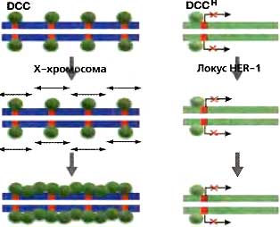 В соматических тканях гермафродита DCC уменьшает экспрессию X наполовину и подавляет экспрессию her-1 в 20 раз. DCC собирается у животных XX. Он рекрутируется к узнающим элементам и распространяется по обеим Х-хромосомам, уменьшая экспрессию многочисленных сцепленных с X генов вдвое. Он также связывается с участком аутосомного гена her-1, находящимся «вверх по течению», и уменьшает экспрессию в 20 раз (обозначается DCCH, чтобы показать, что комплекс, связывающийся с her-1, не имеет белка DPY-21) (видоизменено, с любезного разрешения авторов, из Alekseyenko and Kuroda, 2004; иллюстрация Kathenne Sutliff[©AAAS])
