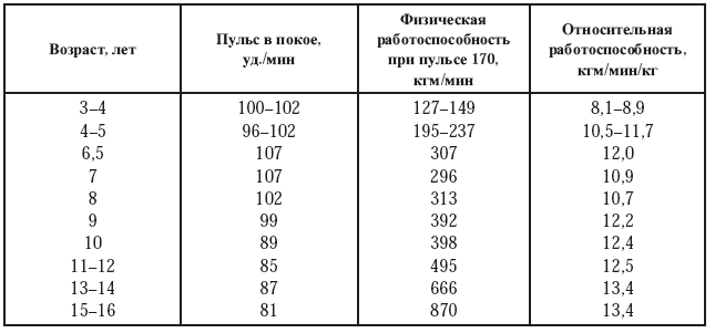 Для оценки общей работоспособности детей рекомендовано использовать адаптированный тест PWC170 с выполнением одной нагрузки вместо двух. Используют нашагивание на скамейку в течение 5 мин в таком темпе, который обеспечивает подъем пульса не менее чем на 40 уд./мин, т. е. до 140–160 уд./мин.