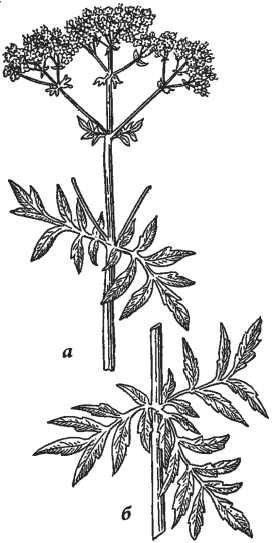 Рис. 114. Валериана (Valeriana officinalis): а — нормальный экземпляр, б — ненормальная, тройная мутовка листьев.
