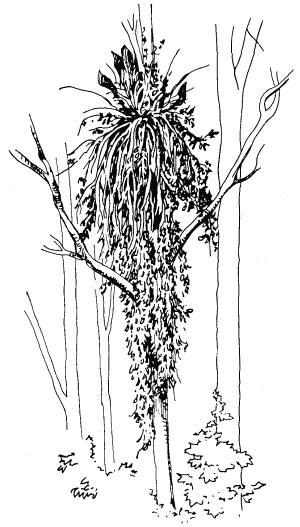 Фото 84. «Муравьиный сад» в тропических заболоченных лесах бассейна Амазонки. Высоко в кронах деревьев муравьи устраивают свои «гнезда-сады». Симбиоз насекомых и растений защищает тех и других от наводнений.