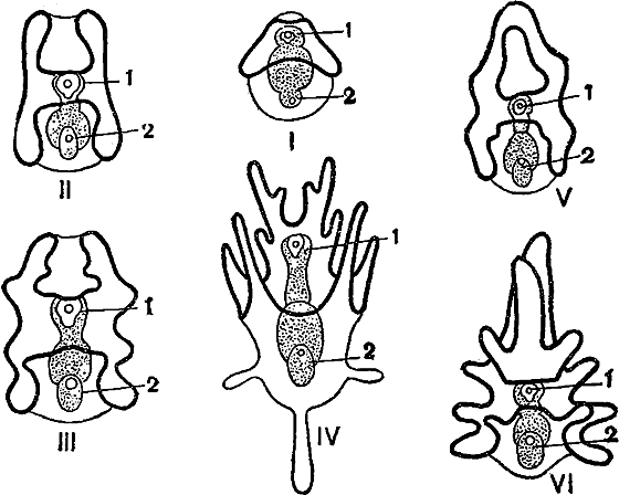 I — общая исходная форма всех личинок; II–III — развитие личинки аурикулярии, свойственной голотуриям; IV — личинка плутеус морского ежа; V–VI — развитие личинки бипиннарии, свойственной морским звездам… 1 — передний отдел кишечника со ртом; 2 — задний отдел кишечника с анальным отверстием. Более толстая черная линия обозначает ресничный шнур.
