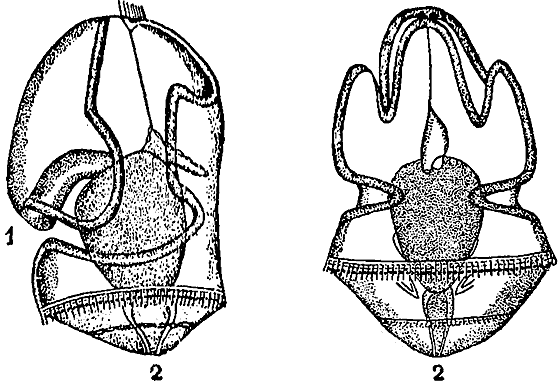Личинка торнария сбоку (налево) и с плоской стороны (направо):