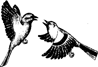 Драка каждой особи обычно происходит на некой ограниченной площади. Это может быть, например, пространство вокруг самки (или самок), как у оленя и многих других животных. Самец горчака охраняет от других самцов участок вокруг раковины пресноводной жемчужницы (рис. 36). К этому моллюску он привлекает самку и стимулирует ее откладывать икринки в его мантийную полость, где они будут развиваться, ведя паразитическое существование. Жук-могильщик рода Necrophorus отгоняет соперников от падали. Следует отметить, что во всех этих случаях охрана относится не только к некому центральному объекту, но и к определенной площади вокруг него, т.е. соперники удерживаются на значительном расстоянии. У некоторых видов такой объект легко заметить: голубь преследует голубку и дерется только вблизи нее. Если передвинуть раковину жемчужницы, горчак переместит следом охраняемую территорию. Однако у большинства видов такая территория неизменна; самец поселяется на выбранном участке и защищает его. Территориальные стычки и угрозы можно наблюдать в любом саду: зарянки, зяблики (рис. 37) и крапивники — заядлые драчуны. Понять значение индивидуальной территории удается, если драки приурочены к какой-то ее точке. Так, у многих дупловых птиц стычки особенно яростны, когда нарушитель границы оказывается вблизи дупла. Однако у многих видов драки затеваются где угодно, и тогда их значение понять труднее. Предполагают, что гнездовой участок многих певчих птиц служит как бы складом корма для потомства. Его размер должен позволять родителям собирать основное количество пищи вблизи от гнезда, т.е. сокращает расстояние, пролетаемое в ее поисках. Поскольку только что вылупившихся птенцов надо постоянно обогревать и кормить, такая территория способствует уменьшению интервалов между их посещениями. Продолжительность отлучки в неблагоприятные для птиц дни может оказаться решающей для выживания потомства. Впрочем, мнения по поводу правильности такого толкования расходятся.