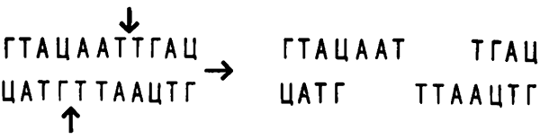 Нужно, следовательно, сначала разрезать в определенном месте двунитевую ДНК, а затем «пришить» к месту разреза другой какой-то фрагмент, также двунитевый. Для разрезания используются ферменты, называемые рестриктазами. Они разрывают двуспиральную структуру ДНК в месте включения определенной последовательности нуклеотидов. Скажем, если это ААТ (и комплементарная ей ТТА), такой разрыв может произойти в обеих нитях у противоположных концов этой последовательности: